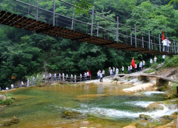 7點(diǎn)的清晨,濕潤(rùn)的空氣中夾雜著些許細(xì)雨,柔柔的飄落在臉上,瑩瑩的泛著光華。公司辦的工作人員們臉上掛著喜悅,忙碌的準(zhǔn)備各項(xiàng)工作,發(fā)放著水和食物。一百多名黨員依序上了兩臺(tái)大巴車(chē),揮舞著鮮亮的黨旗,我們起程了!隨著1個(gè)多小時(shí)的驅(qū)車(chē)行程,我們來(lái)到了虎嘯灘?;[灘位于鄖縣大柳鄉(xiāng)轄區(qū)。這里曾經(jīng)產(chǎn)生了鄖縣第一個(gè)地下黨組織,并成為解放鄖陽(yáng)地區(qū)的前沿陣地?;[灘的河水在流失的歲月中在堅(jiān)硬的石壁上洗出這條河,深有丈余。“歲月千古,逝者如斯。”不經(jīng)意,你會(huì)追憶起那些在歷史的星河中,消逝的革命先烈們。走在這里,年輕的正奧黨員們似乎都感受到了水滴石穿的深刻哲理和鍥而不舍的革命精神,同時(shí)也領(lǐng)略到了革命老區(qū)的魅力所在。深林奇石間、索橋水澗旁,正奧公司的100多名黨員干部們揮動(dòng)著鮮紅的黨旗,猶如一條巨龍游行其間。悠悠山谷中不時(shí)回蕩出幾首紅歌。大家并肩攜手,空氣是溫潤(rùn)的。今天這片山林中,個(gè)中滋味,好不自在!
